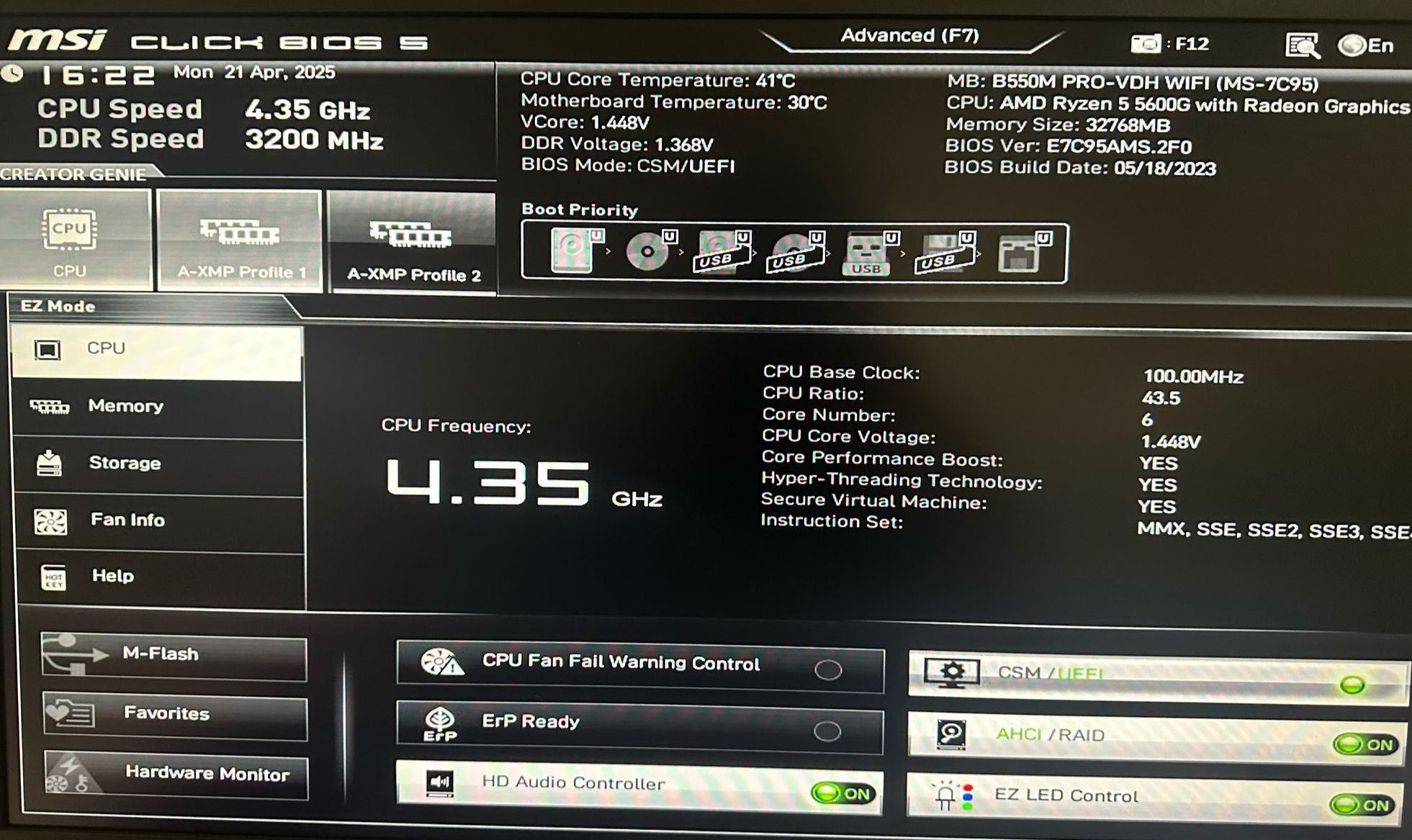 The B550M motherboard was optimized by enabling the A-XMP (Extreme Memory Profile) to allow the RAM to operate at its maximum supported frequency, ensuring peak memory performance. Additionally, TPM 2.0 (Trusted Platform Module) was activated in the BIOS to meet the Windows 11 security and compatibility requirements, enabling secure boot and system integrity features.